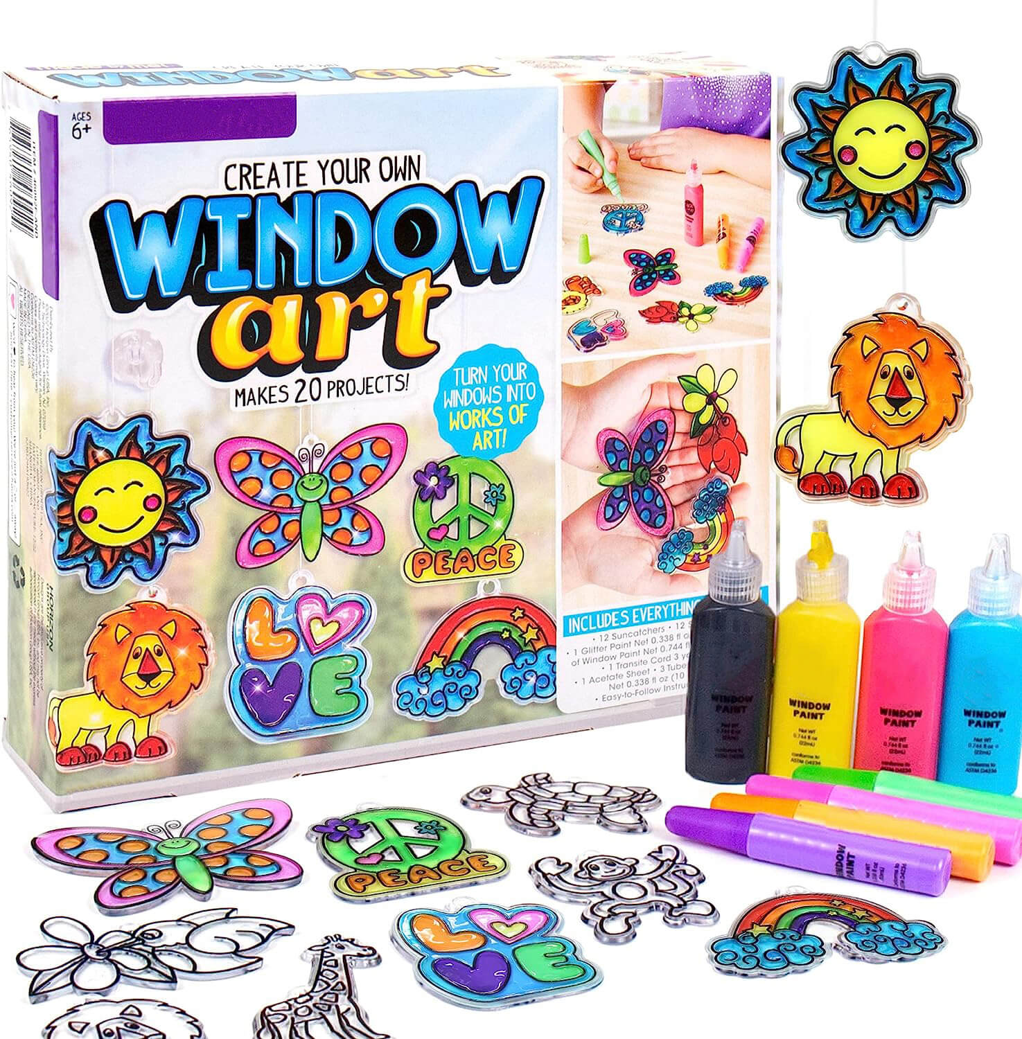 and display their own colorful suncatcher-style window art. Each kit includes 3D transparent hanging designs,