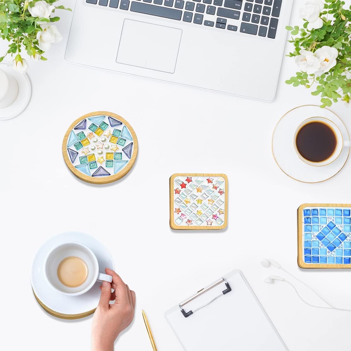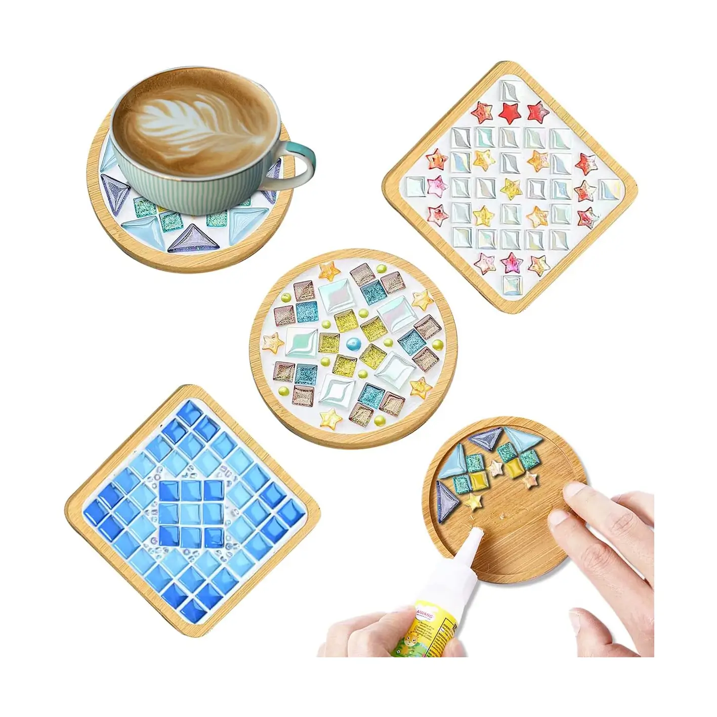 Each set includes mixed-color glass mosaic tiles and a wooden coaster base,